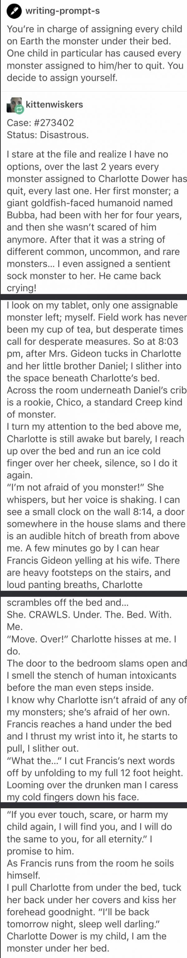 When I was younger, the scariest thing to deal with was the monsters under the bed. Now, the scariest thing children have to deal with are the real monsters, in the real world. I came across a writing prompt on Pinterest © this evening and it made me realise that I am a monster under the bed. This will make more sense once you’ve read it…