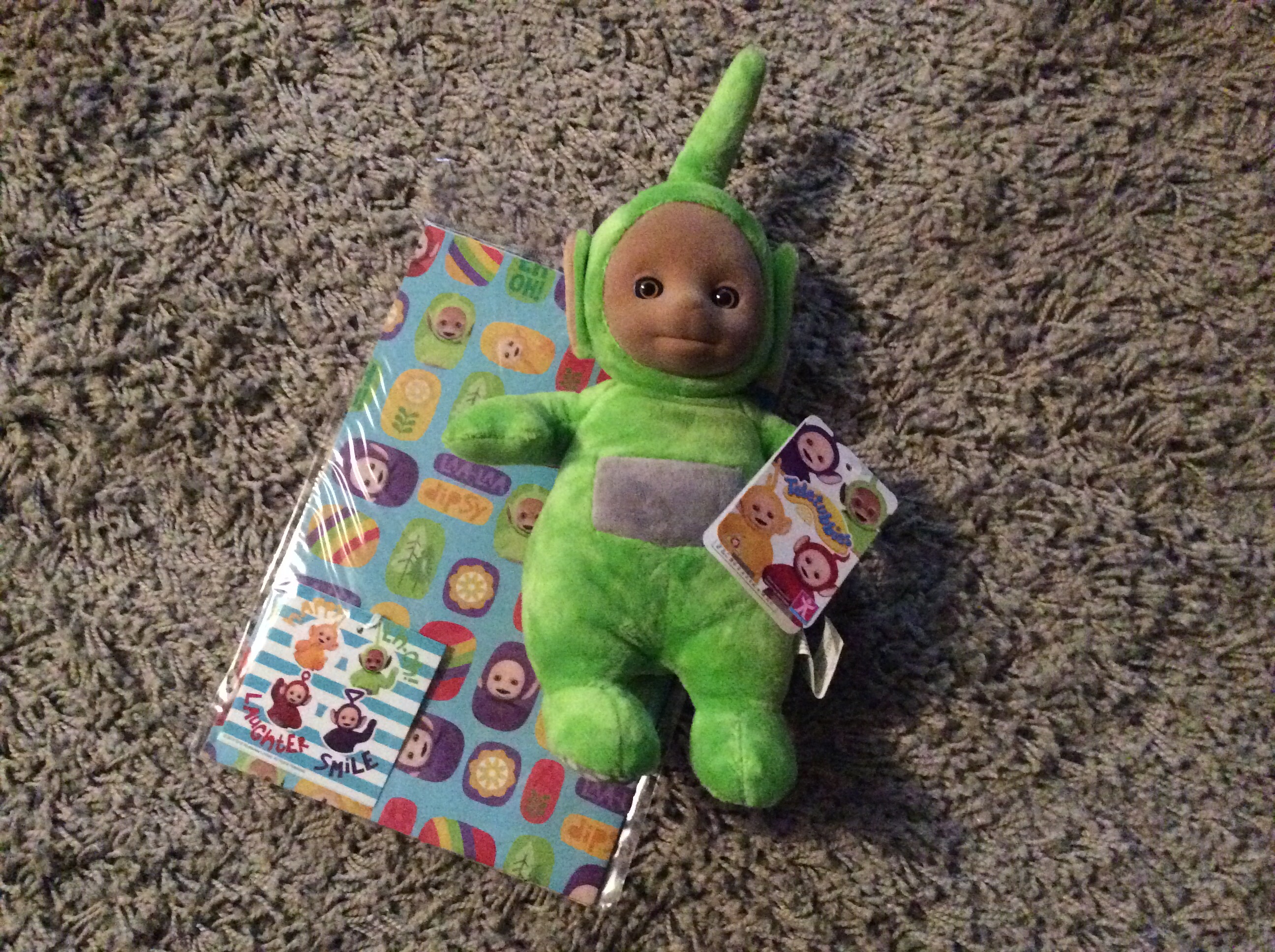 I initially only went into the shop to buy a Dipsy soft toy, for my niece’s second birthday on Thursday, but a carefully placed design of wrapping paper added to my £10 shop ever so slightly. As I reached onto the top shelf to grab the green Dipsy doll, Po made a suicidal jump off the shelf, landing on the floor with an “E-oh,”. I quickly picked her up, dusted her face and placed her at the back of the shelf. No more jumps for freedom on my watch.